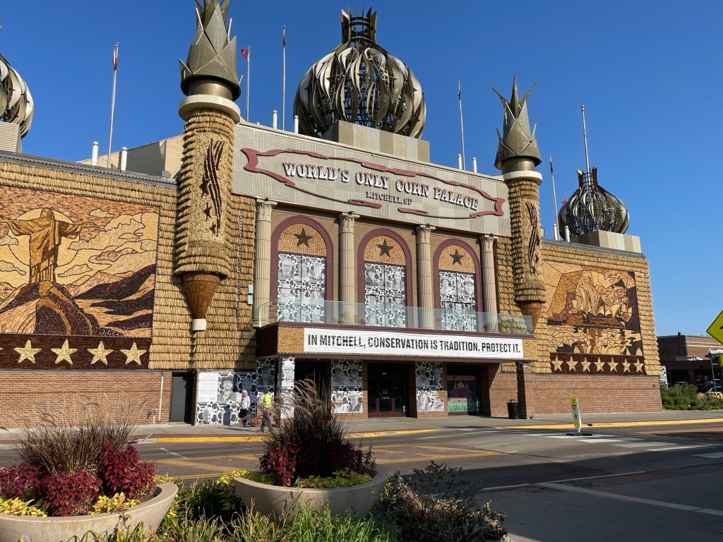 We are in Mitchell, South Dakota. Home of the Corn Palace! We went to visit as we hadn’t been here since the boys traveled here with us. They were closed. So we got a picture of Mark with the corn statue. He’s always willing to ham it up!